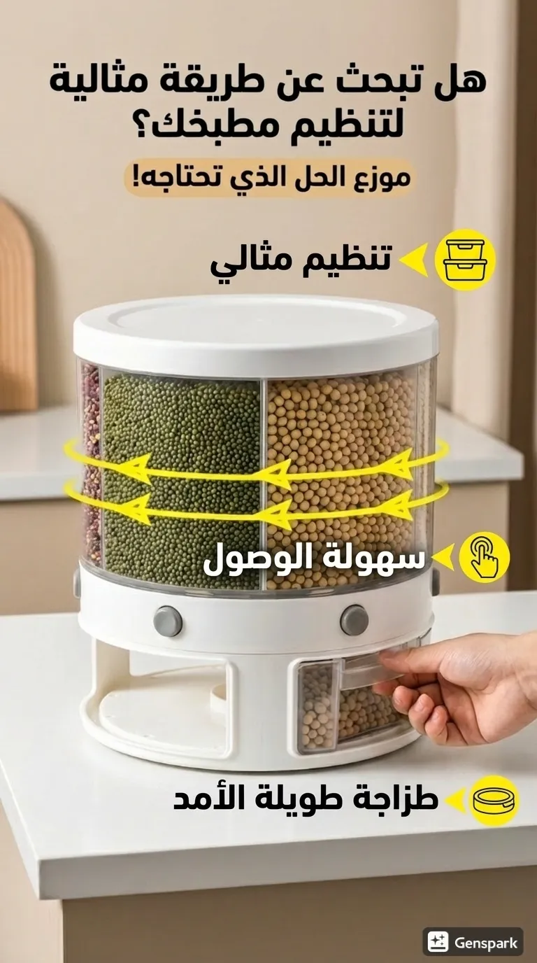 "الموزع هذا يريحني مرة في المطبخ. الحبوب والسناكس ما عاد تتناثر مثل قبل. شكل عصري وحلو."